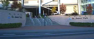 St James' Park is spelt with James' featuring one s and an apostrophe mark, as seen on the signage of the St James' Park steps outside the entrance to the stadium, and signage inside the adjacent Metro station. The use of an apostrophe is in contrast with the name of the Metro station itself, which is signed as St James Metro station, and with the street signs[45] of the nearby St James Street[46] and St James Terrace.[47] Further, the use of one s and an apostrophe mark differs from the common convention of adding a second s to monosyllabic possessives ending in s, as is the case with the well-known public space in London: St James's Park.