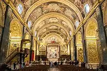 For the first century of its existence, the church's interior was modestly decorated. However, in the 1660s, Grand Master Raphael Cotoner ordered the redecoration of the interior so as to rival the churches of Rome. Calabrian artist Mattia Preti was in charge of the embellishment, and effectively completely transformed the interior in the Baroque style.[12] The annexes on the side of the cathedral were added later and feature the coat of arms of Grand Master António Manoel de Vilhena who reigned from 1722 to 1736.[11]