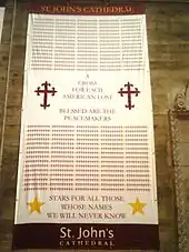 In recent years, the St. John's community actively voiced its opposition to the War in Iraq and other interventions in the Middle East. Each Sunday, the names of each American military person who died in the war were read at the church's services. A banner at the back of the church had a cross marked for each American death in the war. And during the procession of the palms during Palm Sunday services, members of the congregation carried anti-war protest signs along with their palms.
