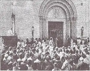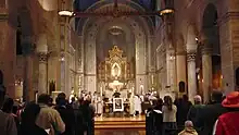 The new church opened in 1924, after two years of construction, and was consecrated in 1925. The Los Angeles Times reported that the last service in the old church was "rife with tender memories" and an "added charm and reverence pervaded the occasion."[9] When the new church opened the following week, the Times called it "one of the most beautiful and costly edifices in the country."[10] Another report noted: "Critics declare it the most beautiful in Los Angeles."[11] Built at a cost of $650,000 (approximately $8.85 million in 2022[12]), the church was described at the time as a "close copy of an Italian church of the sixth century in built at Toscanella."[10]