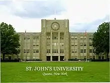 St. John's University is a private Roman Catholic university in Queens, New York City. It was founded in 1870 by the Congregation of the Mission (C.M., the Vincentian Fathers) with a mission to provide the youth of New York with a Catholic university education.[4] Originally located in the Brooklyn borough of New York City, the flagship campus was moved to its current location in the Queens borough during the 1950s.[5] St. John's has additional New York City campuses in Staten Island and Manhattan, as well as the Long Island Graduate Center in Hauppauge, New York.[6] Additionally, the university has international campuses located in Rome, Italy, Paris, France,[7] and Limerick, Ireland.[8] The university is under the patronage of Saint John the Baptist.[5]