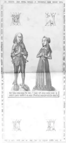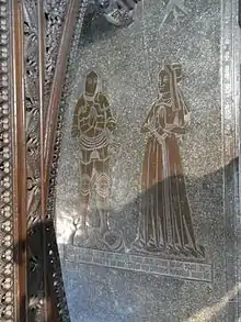 Above the figure of his wife Alice Twynyho are sculpted the arms of Twynyho: Argent, a chevron between three lapwings sable. The two arms are impaled in the two similarly sculpted shields, one at the feet of each brass figure. It is remarkable that the wife should be represented with so old a face, since her death preceded her husband's by nearly thirty years. Her dress is peculiarly simple and elegant, with the exception of the wired head-dress, which is "of an early and unpleasing form".[14] The ledger line is inscribed in Latin and English, unusually with lettering designed to be read from the outside instead of in the usual way, as follows:[14]