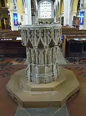 Features surviving from the 15th century and of particular note are the baptismal font, which dates from about 1470 and around the base of which the figures of the Twelve Apostles were damaged by Puritan soldiers during the English Civil War when Oliver Cromwell garrisoned his troops in the church; the pulpit dates from about 1500 and no longer has its canopy, its ‘wine-glass‘ base or its clerk's desk.[6]