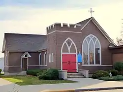 The church is L-shaped and faces north onto First Street. The main block contains its nave. A smaller gabled ell contains the sacristy and extends toward Wardwell Avenue at the left rear. At the left front of the church is a crenellated tower. The church also has a half-hexagonal apse at the back of the nave.[2]