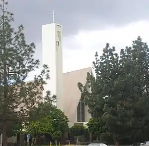 The main church structure is an A-frame built with poured concrete and 80-foot steel beams. It was considered "radical" and "daring" at the time.[3] It was designed by Los Angeles architect Earl Trudeau.[6] The church was built on a seven-acre parcel that had previously been a walnut grove. Work began in February 1956 for what was referred to as "the most modern and largest Catholic church and school" in the San Fernando Valley.[7] It was the first building costing more than $500,000 planned for Woodland Hills.[8] Construction of the church was completed in the summer of 1958.[9]