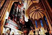 The church is perhaps best known for its organ. It was built by the German builder Edmund Schulze.[22] It was originally installed in Meanwood Towers in 1869. In 1877 it was inaugurated in St. Peter's Church, Harrogate. Following a dispute with the vicar, the organ was installed in St. Bartholomew's in 1879. It was rebuilt in 1905 by James Jepson Binns and other restoration work took place in 1956 by Hill, Norman and Beard, 1974 by John T. Jackson and Son and 2004 by Harrison & Harrison.