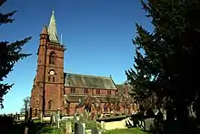 The church is constructed in red sandstone with a grey-green slate roof and a shingled spire.[1] The architectural style is that of the late 13th century.[3] Its plan consists of a west tower, a four-bay nave with a clerestory, north and south aisles, a chancel with a north chapel, and a south vestry, and a south porch. The tower is in three stages with a recessed octagonal spire, and at its southwest is an octagonal stair turret with a small stone spire. Lancet windows are in the first and second stages of the tower, above which are paired bell-openings. At the top is a corbelled open parapet. A rose window is in the north wall of the chapel. Over the south doorway is the damaged dedication stone from the former church.[1] The porch is in striped stone, and has a pointed barrel vault.[3]