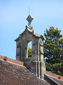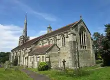 St Mark's Church is a Gothic Revival building in the 14th-century Perpendicular style. It is built entirely of local stone.[6][27] There is a short tower at the west end, topped by a recessed broach spire with shingles and dormer openings.[13][15] The base of the tower forms a porch containing the entrance.[27] Beyond this, the nave has an arch-braced roof, aisles on both sides and a three-part arcade—a layout favoured by George Fellowes Prynne.[15] The side arches lead to a Lady chapel (attached to the south side of the chancel) and a vestry.[6][15] The gable end of the chancel roof has a bellcote.[6][13]