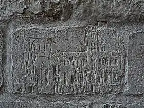 Below and on the same wall is inscribed a sketch thought to be of Old St Paul's Cathedral which burnt down in the Great Fire of London in 1666. This is the most important of the graffiti in St Mary's, not only because the depiction is of national importance but also because the mediaeval depiction of buildings in such detail is rare, even in manuscripts. The date the depiction was made was sometime in the 14th or 15th century. Architecturally, it shows a building in the Perpendicular style of about 1350 to 1500. It cannot be earlier than the masonry of St Mary's church which dates from about 1340, and if it actually does depict St Paul's it cannot be later that 1561, when the spire of St Paul's fell down.[8]