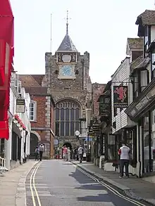 Rye had been held by the Abbey of Fécamp in Normandy for a long time as a Royal deed of gift. This status originating from times before the Norman Conquest got lost at 1247, but until this relationship ended the profit for the parish had been so great that a large church could be built, which was called the "Cathedral of East Sussex" until recent times. During a severe raid by French marauders, the town and the parish church were looted and set on fire. The damage to the church was extensive, and the last repairs resulting from this fire were made in the 19th century. The following year a group of men from Rye and Winchelsea struck back and recovered the loot including the stolen bells. To deter potential invaders from any future attack one of the bells was hung in the Watchbell Street.[1][2][3] The Huguenot Lewys Billiard made the "New Clock", which is one of the oldest church turret clocks that still works. It had been installed in 1561–2. A huge pendulum reaching into the church's body was added later, as was the actual face of the clock and the so-called "Quarter Boys".[1]