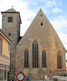 Around 1183, a church was built on the present site, donated by the patricians Walter Kerlinger and Dietrich Hotermann as well as Conrad Brun and Heinrich de Stalberg. At that time, the church was located on the Via Regia next to the Jewish quarter of Erfurt. The late-Romanesque lower storeys of the tower today are still from the first church.[2] Then, between 1278 and 1290 – under the long-time pastor Heinrich Bauso – a choirless Gothic hall was built, the core of today's church.[2]