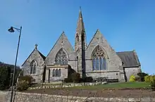The church is constructed in limestone with sandstone dressings and slate roofs. Its plan consists of a nave, north and south aisles, a south porch, and chancel with a polygonal apse. At the west end is a bell turret topped by a stone spirelet. Inside the church are five-bay arcades carried on marble piers with sandstone capitals. Also in the church are two pairs of churchwardens' stalls dating from the 20th century, and a wooden font.[2] The east window in the south chapel dates from 1888 and was designed by S. Evans; the other windows date from the 20th century and are by Shrigley and Hunt or by Abbott and Company.[3] The two-manual pipe organ was built in 1873 by William Hill and Son, and restored in 1933 by Wilkinson and Son of Kendal.[7]