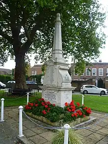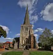 The Church of England parish church of St Mary the Virgin[9] is a Norman building with a 14th-century Gothic chancel and 15th-century Perpendicular Gothic west tower. The tower has a spire with wood shingles. Inside the church are monuments to members of the Knyvet(t) family who bought Staines manor after their foiling of the planting of the gunpowder and Fawkes.
