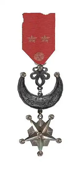 Its second design is based on a double-sided five-pointed star of dark green enamel with gold ball finials at the end of each point. Diamonds were no longer used. The star is layered over rays of gold between each arm. A raised Arabic inscription is encircled in the center of the star. This is suspended from a large golden crescent with small green enamel star(s) on it (three on the Commander grade and one on the Knight grade). The original metal design of this Order varies considerably from the later enameled version. The Order of the Star of Anjouan was related to this order.