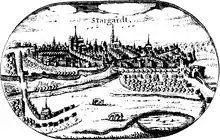 Stargard was part of the Duchy of Pomerania until its dissolution after the death of the last duke Bogislaw XIV in 1637.[6] During the Thirty Years' War the city was captured by Sweden in 1630.[8] It was besieged by the troops of the Holy Roman Empire in 1635,[10] and in order to hamper the attacks the Swedish commander set fire to the suburbs, causing a city fire, however, it was still captured by imperial troops.[11] In 1636 it was recaptured by the Swedes, then it was taken and plundered by Imperial troops to fall back to the Swedes again after the Battle of Wittstock.[12] In 1637 it was again captured by Imperial troops and then by Sweden.[12] As a result of the war, the population decreased by about 75%.[13]