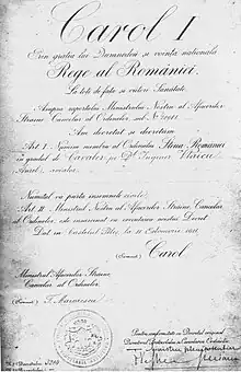 In April 1877, when Romania gained independence from the Ottoman Empire, the debate regarding the institution of Romanian decorations was revived. Mihail Kogălniceanu, Minister of Foreign Affairs in the Ion Brătianu cabinet, took part in the debates in the Assembly of Deputies regarding the institution of a state decoration. Because of the already earlier supplied "Order of The Union", it was decided that the shape of the decoration would be the same, modifying only the domnitor's seal. The motto was also changed, because the old one was not appropriate to the moment, to "IN FIDE SALUS" ("IN FAITH IS THE SALVATION"). Regarding the name, Kogălniceanu insisted on "Steaua Dunării" ("The Star of The Danube").[1]