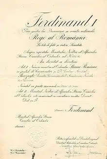 In 1938, the order was given a superior rank, called "Clasa I" (First Class in English), between the Grand Officer rank and the Grand Cross rank, with a maximum of 50 civilians and 15 military personnel.[1]