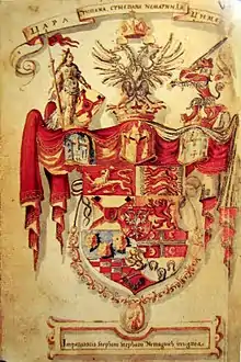 On 16 April 1346 (Easter), Dušan convoked a huge assembly at Skopje, attended by the Serbian Archbishop Joanikije II, the Archbishop of Ochrid Nikolas I, the Bulgarian Patriarch Simeon, and various religious leaders of Mount Athos. The assembly and clerics agreed upon, and then ceremonially performed, the raising of the autocephalous Serbian Archbishopric to the status of Serbian Patriarchate.[1][31] The Archbishop from then on was titled Serbian Patriarch, although some documents called him Patriarch of Serbs and Romans, with the seat at the Monastery of Peć.[1] The first Serbian Patriarch Joanikije II solemnly crowned Dušan as "Emperor and autocrat of Serbs and Romans" (Greek Bασιλεὺς καὶ αὐτoκράτωρ Σερβίας καὶ Pωμανίας).[1] Dušan had his son Uroš crowned King of Serbs and Greeks, giving him nominal rule over the Serbian lands, and although Dušan was governing the whole state, he had special responsibility for the Eastern Roman lands.[32][1] A further increase in the Byzantinization of the Serbian court followed, particularly in court ceremonial and titles.[1] As Emperor, Dušan could grant titles only possible as an Emperor.[33] In the years that followed, Dušan's half-brother Symeon Uroš and brother-in-law Jovan Asen became despotes. Jovan Oliver already had the despot title, granted to him by Andronikos III. His brother-in-law Dejan Dragaš and Branko Mladenović were granted the title of sebastocrator. The military commanders (voivodes) Preljub and Vojihna received the title of caesar.[33] The raising of the Serbian Patriarch resulted in the same spirit as bishoprics became metropolitans, as for example the Metropolitanate of Skopje.[33]