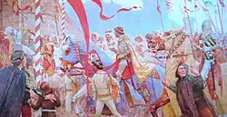 Dečanski's decision not to attack the Byzantines after the victory at Velbazhd, when he had an opportunity, resulted in the alienation of many nobles,[15] who sought to expand to the south.[16] By January or February 1331, Dušan was quarreling with his father, perhaps pressured by the nobility.[16] According to contemporary pro-Dušan sources, advisors turned Dečanski against his son, and he decided to seize and exclude Dušan from his inheritance. Dečanski sent an army into Zeta against his son; the army ravaged Skadar (modern Shkodër), but Dušan had crossed the Bojana river. A brief period of anarchy took place in parts of Serbia before father and son concluded peace in April 1331.[15] Three months later, Dečanski ordered Dušan to meet him. Dušan feared for his life and his advisors persuaded him to resist, so Dušan marched from Skadar to Nerodimlje, where he besieged his father.[15] Dečanski fled, and Dušan captured the treasury and family. He then pursued his father, catching up with him at Petrich. On 21 August 1331 Dečanski surrendered, and on the advice or insistence of Dušan's advisors, he was imprisoned.[15] Dušan was crowned King of All Serbian and Maritime lands in the first week of September.[16]