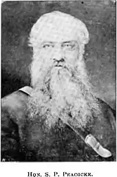 After the war, in 1865, Colonel Peacocke (or Ponsonby as he was called) turned his attention to politics. He represented the Pensioner Settlements electorate on the Auckland Provincial Council from 2 November 1865 to 7 September 1869.[25] He was a member of the provincial executive council in May 1867.[26] He was called to the Legislative Council on 8 May 1866[7] and attended several sessions of Parliament in Wellington, where he became known as a polished and effective speaker. He served as Commissioner of Crown Lands between 1867 and 1868. He continued to be a member of the Legislative Council, but his membership lapsed due to non-attendance and his final date of membership is the same as his death date.[7][27]