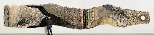 Biography (2008–13) draws on elements of Siegel's intimate pieces and large installations, combining dense, intricately woven detail, diverse postconsumer materials, and an epic, undulating horizontal sweep.[40] At 156 feet long, the mixed-media wall piece has only been viewed in large sections (of up to 100 feet) exhibited at Marlborough (2011, 2013) and the Albany Airport (2018– ) or digitally, via composite photographs.[9][41][19] Functioning as both a geologic and personal timeline, it was constructed organically from right to left without a fixed endpoint, using Siegel's characteristic strategies of accumulation, compression and transformation.[2][3][5] Writers have compared it in scale and density to the Abstract expressionist paintings of Jackson Pollock and the Pop assemblages of Nancy Rubins, and visually, to shifting landscape tectonics, a vast topographical map, or DNA.[41][9] Artforum's Allese Thomson Baker wrote, "Siegel commands the detritus of our culture into a frantic rhythm, nailing contemporary anxieties about the environment to the wall. [He] may image our world out of rubbish, but the result is ravishing, glittering, and glistening in all its synthetic, inorganic wonder."[9]