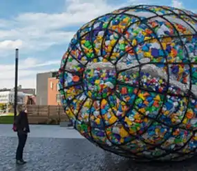 In other installations, Siegel created works in contrast to landscaped and idyllic sites that suggested both minimalist sculpture and functional objects such as collections of material en route to being recycled.[25][1][37] For example, Bale (2001, University of Virginia) was a ten-foot, minimalist cube of crushed plastic bottles strapped together with rubber hose.[37] Similar installations included Can Can (Bowling Green State University, 2002), a warped sphere of bound aluminum can discards; E-virus (2006, Stanford University), a cylinder formed from electronic waste; cubes of Grass Paper Glass (2006, Grounds For Sculpture), and Like a Buoy, like a Barrel (2019, Providence, RI), among others.[25][8][14][38]