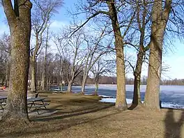 The lake is about 5.4 kilometres (3.4 mi) long and 2.5 kilometres (1.6 mi) wide, and lies at an elevation of approximately 138 metres (453 ft). There are two named islands, Butternut Island and Grant Island, and one named bay, Cosy Cove at the northeast. The primary inflow is the Moira River, at the northwest. Secondary inflows are the Clare River at the east and Sulphide Creek at Cosy Cove at the northeast. The primary outflow is the Moira River, which exits via two channels: the eastern channel, designated the Moira River, and the named Western Channel. The two enclose Sugar Island. There are three settlements on the lake: the village of Tweed at the Moira River inflow at the northwest; Cosy Cove, on the bay Cosy Cove and at the Sulphide Creek inflow at the northeast; and Stoco at the Moira River eastern channel outflow. The Moira River flows into the Bay of Quinte on Lake Ontario at Belleville.