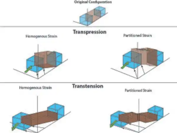 Block diagram illustrating the difference between homogeneous and partitioned strain within transpressive and transtensive tectonic regimes. The partitioning of strain occurs through the development of a strike slip or shear zone (shown with red arrows) across the actively deforming region (brown). Adaptation and modification from (Teyssier et al., 1995;[10] Fossen, 2012;[3] Jones and Tanner, 1995;[1] Sanderson and Marchini, 1984[13])