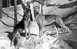 Trimble trained Strongheart and directed him in four rugged outdoor adventure films scripted by Murfin: The Silent Call (1921), Brawn of the North (1922), The Love Master (1924), and White Fang (1925).[7] Strongheart became the first major canine film star,[8] preceding the fame of Rin Tin Tin by two years.[9]