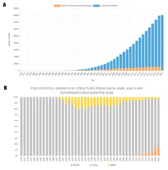 The Protein Data Bank (PDB) is a database of 3D structure data for large biological molecules, such as proteins, DNA, and RNA. PDB is managed by an international organization called the Worldwide Protein Data Bank (wwPDB), which is composed of several local organizations, as. PDBe, PDBj, RCSB, and BMRB. They are responsible for keeping copies of PDB data available on the internet at no charge. The number of structure data available at PDB has increased each year, being obtained typically by X-ray crystallography, NMR spectroscopy, or cryo-electron microscopy.