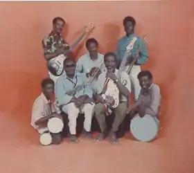 The popular singer Abu Araki al-Bakheit was banned from performing his political songs, but eventually managed to continue performing in defiance of the authorities[60] and had a comeback in 2019 during the Sudanese revolution.[61] Others, like the southern Sudanese singer Yousif Fataki had all their tapes erased by Radio Omdurman. Other performers that continued to be popular during this time include Abdel Karim al Kabli or Mahmoud Abdulaziz, both with a notably long and diverse history of performance and recordings, as well as Mohammed al Amin and Mohammed Wardi.[62] Occasionally accompanying Wardi and poetry recitals, blind oud player Awad Ahmoudi has been known for his distinct style of playing the oud in his typical style and pentatonic scales.[63]