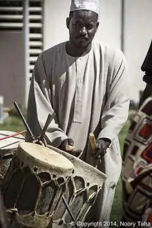 One of the most typical East African instruments, called tanbūra or kissar in Nubian music,[10] was traditionally played by the singers as the usual accompaniment for such songs, but this Sudanese lyre has largely been replaced in the 20th century by the Arabic oud.[lower-alpha 3] Drums, hand clapping and dancing are other important elements of traditional musical performances, as well as the use of other African instruments, like traditional xylophones, flutes or trumpets. One example for this are the elaborate wooden gourd trumpets, called al Waza,[12][13] played by the Berta people of the Blue Nile state.