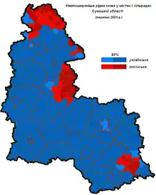 At the 2001 census, the ethnic groups within the Sumy Oblast were: 88.8% Ukrainians, 9.4% Russians.[11]