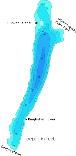 Sunken Island, also known as Hutters Island,[2] is a sunken island on Otsego Lake in Otsego County, New York. Sunken Island is several feet below the surface of the lake and is marked with 4 buoys to prevent boats from running aground. Sunken Island is described in the writings of James Fenimore Cooper upon which a structure once stood.