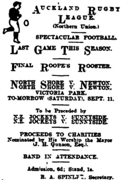 On August 28 both teams wore black arm bands after learning of the death of player Sergeant Major Charles Sinton who had been killed at the Dardanelles.[28] On September 11 the 4th grade side played against a N.Z. Jockeys team at Victoria Park as a curtain-raiser to the Roope Rooster final between North Shore Albions and Newton Rangers.[29] The Sunnyside team won 9-3 with “the most prominent players” for them being Sydney Wynyard (younger brother of former New Zealand internationals Richard Wynyard, and William Wynyard), N.M. Robertson, A.G. Martin, and V. White.[30]