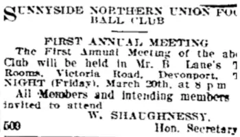 On Tuesday, March 17, 1914, it was reported in the Auckland Star that "a new club – the Sunnyside Club – has been formed at Devonport, to take part in the coming season's competitions under league rules. The club has already a large membership, and intends to enter five teams, including a senior team. It is understood that several well known rugby players will be found in the Sunnyside ranks this season. The first annual meeting will be held on Friday".[1] The first meeting was held that Friday, the 20th of March at (B.) Lane's Tea Rooms in Devonport at 8pm. It was reported that their organiser, Mr William Joseph O'Shaughnessy had “secured” their playing numbers which also included “several leading league men”, and that they had gained the use of the Devonport Domain to train and play on along with the North Shore Albions league club. Their 3rd grade A team was ultimately made up of a large number of the North Shore Albions 3rd grade B team of 1913.[2][3]
