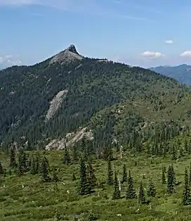The history of the formation of the Cascade Mountains dates back millions of years ago to the late Eocene Epoch.[5] With the North American Plate overriding the Pacific Plate, episodes of volcanic igneous activity occurred.[5] Mount Adams, a stratovolcano that is 15.7 mi (25.3 km) southeast of Sunrise Peak, began forming in the Pleistocene.[4] Due to Mount Saint Helens' proximity to Sunrise Peak, volcanic ash is common in the area. Sunrise Peak is composed of Pliocene-Miocene andesitic magma that intruded up into older volcanic rocks more than five million years ago and is now surrounded by a forest of old-growth Douglas fir and mountain hemlock.
