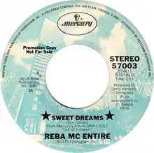 Entertainer Reba McEntire recorded her version on Out of a Dream, her second album, in 1979. "Sweet Dreams" gave her her first solo top 20 hit, peaking at #19 on the Hot Country Songs chart. For many years until March 15, 1991, McEntire closed her concerts with an a cappella version of the song.