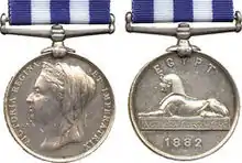 In January 1881, Eardley-Wilmot was promoted to commander and transferred to the Admiralty for three years until May 1884 when he took command of HMS Dolphin, a composite sloop, in the Mediterranean where the ship took part in military operations in eastern Sudan in 1884–1885. He was at Suakin and took part in defending attacks on the camp there. He took part in the blockade of the coast of Greece. He received the Egypt Medal (second version) with Suakin clasp and the accompanying Khedive's Bronze Star.[1] At an unknown date he received the Order of Osmanieh, fourth class, of the Ottoman Empire.[3]
