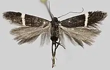 The wingspan is 10–14 mm. The forewings are bronzy-black; a nearly straight narrow white fascia beyond middle. Hindwings are fuscous, darker posteriorly. Under-surface with white fascia appearing only as a costal spot on forewings. The larva is pale green, suffused with reddish head pale yellow-brown; 2 with four black semilunules filled with yellow-brown. [2]