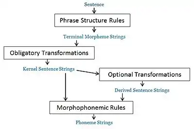 Chomsky's transformational grammar has three parts: phrase structure rules, transformational rules and morphophonemic rules.[68] The phrase structure rules are used for expanding grammatical categories and for substitutions. These yield a string of morphemes. A transformational rule "operates on a given string ... with a given constituent structure and converts it into a new string with a new derived constituent structure."[8] It "may rearrange strings or may add or delete morphemes."[69] Transformational rules are of two kinds: obligatory or optional. Obligatory transformations applied on the "terminal strings" of the grammar produce the "kernel of the language".[68] Kernel sentences are simple, active, declarative and affirmative sentences. To produce passive, negative, interrogative or complex sentences, one or more optional transformation rules must be applied in a particular order to the kernel sentences. At the final stage of the grammar, morphophonemic rules convert a string of words into a string of phonemes.[69] Chomsky then applies this idea of transformational rules in the English auxiliary verb system.[70]