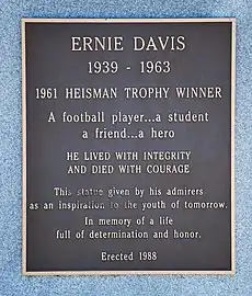 In 1959, Syracuse earned its first consensus national championship (finishing No. 1 in both the AP and Coaches' Polls) following an undefeated season (11–0) and Cotton Bowl Classic victory over Texas. The team featured sophomore running back Ernie Davis (of Elmira, New York), who went on to become the first African American to win the Heisman Trophy in 1961,[22] and All-American tackle Ron Luciano, who eventually become a prominent Major League Baseball umpire. Davis was slated to play for the Cleveland Browns in the same backfield as Jim Brown, but died of leukemia before being able to play professionally. Syracuse remained competitive through the 1960s with a series of All-American running backs, including Floyd Little and Larry Csonka (both inductees in the Pro Football Hall of Fame).[23][24]