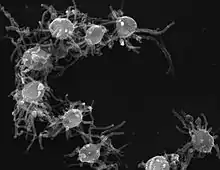 In solid cultures, solitary cells can sometimes merge completely at the bottom of the Petri dish into a syncytium-like or pseudoplasmodium structure, in which the nuclei do not merge. From these syncytia, budding of daughter cells occurs. This phenomenon of budding from syncytia has not been observed in any other eukaryotes, although the formation of multinucleated cells as a result of aggregation of multiple cells is known in other protist lineages (dictyostelids in Eumycetozoa, Copromyxa in Tubulinea,[4] acrasids in Excavata,[5] Sorogena in Alveolata,[6] Sorodiplophrys in Stramenopiles, Guttulinopsis in Rhizaria,[7] and Fonticula alba within the opisthokonts).[8] The transition from an amoeboid filopodial stage to an aggregative stage is also observed in another holozoan, Capsaspora owczarzaki. The formation of Syncytia also occurs in animals; the cytoplasm of glass sponges, teguments of flatworms, and the skeletal muscles and placenta of mammals are all syncytial structures.[2]