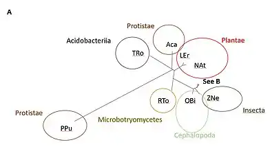 TBC1D30 has a large amount of orthologs. Analysis of these homologs allow us to ascertain the most important amino acids, i.e., the ones that are conserved. The most highly conserved amino acids among vertebrates, invertebrates, fungi, plants, bacteria and protists with available sequences were trp236, arg255, trp259, ile297, asp300, arg303, thr304, leu321, leu325, ala327, gly336, tyr337, cys338, gln339, leu349, glu356, pro399, trp432, trp450, asp451, arg463, and leu466.[21][22] The RabGAP domain within the gene originated approximately 4 billion years ago, as it is present within Terriglobus roseus,[23] which is an acidobacterium that diverged from humans 4.09 billion years ago.[24] The whole gene likely originated approximately 1.3 billion years ago, as there are still amino acids conserved past the RabGAP domain, and into the DUF4682 domain for Lithospermum erythrorhizon and Nicotiana attenuata.[23] These two plants diverged from humans about 1.275 billions years ago.[24]