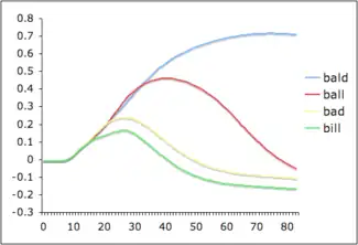 For example, a listener hears the beginning of bald, and the words bald, ball, bad, bill become active in memory. Then, soon after, only bald and ball remain in competition (bad, bill have been eliminated because the vowel sound doesn't match the input). Soon after, bald is recognized. TRACE simulates this process by representing the temporal dimension of speech, allowing words in the lexicon to vary in activation strength, and by having words compete during processing. Figure 1 shows a line graph of word activation in a simple TRACE simulation.