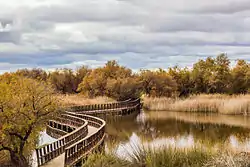 Tablas de Daimiel National Park (Parque Nacional de las Tablas de Daimiel) is a wetland on the La Mancha plain, a mainly arid area in the province of Ciudad Real. With an area of about 3,000 hectares, the park is the smallest of Spain's fifteen national parks.[3] The protected area is in the process of being expanded outside the original nature reserve to include neighbouring dryland farming areas. The expansion is part of efforts to improve the condition of the wetland, which has been damaged by over-exploitation of water resources.[1]