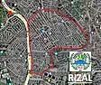 According to the cadastral map of Taguig, the boundary and jurisdiction limit of Taguig is the Rio del Pueblo now called Tapayan River, a tributary of the Pasig River from Barangay Pinagbuhatan, Pasig to Barangay Santa Ana, Taytay, Rizal.[35] The city has an area of 59 square kilometers (23 sq mi), now including the Embo and Post Proper barangays previously from Makati.
