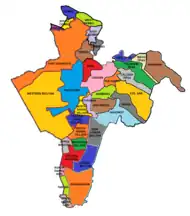 In 1974, the name of Taguig's political subdivisions was changed from "barrios" to "barangays" following the nationwide implementation of the Integrated Reorganization Plan (IRP) under Presidential Decree No. 557.[27] The IRP increased Taguig's administrative divisions to 18 barangays, namely, Bagong Tanyag, Bagumbayan, Bambang, Calzada Tipas, Hagonoy, Ibayo Tipas, Ligid Tipas, Lower Bicutan, Maharlika, Napindan, Palingon Tipas, Signal Village, Santa Ana, Tuktukan, Upper Bicutan, Ususan, Wawa, and Western Bicutan.