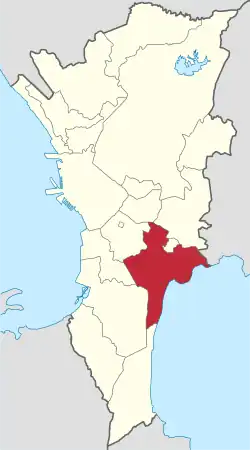 The city is located in the southeastern portion of Metro Manila and bordered by Pasig and Pateros to the north, Makati and Mandaluyong to the northwest, Pasay and Parañaque to the west, Cainta and Taytay, Rizal to the northeast and Muntinlupa to the south.