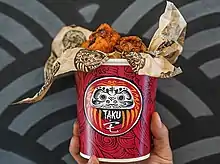 Taku’s menu offers marinated, battered and twice-fried karaage nuggets and wings.[6] Additionally, it includes a F*ck it Bucket, chicken karaage rice bowl, a curry karaage burger and a selection of classic Japanese sides like mac salad, furikake fries, cabbage salad and miso soup.[7][8][9][10]